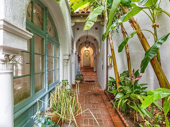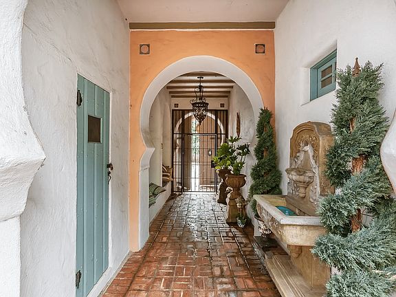 Decorative fireplaceClassic spanish architectureCustom cabinetryCharming arched detailsFarmhouse-style sinkDramatic high ceilingsBuilt-in shelving