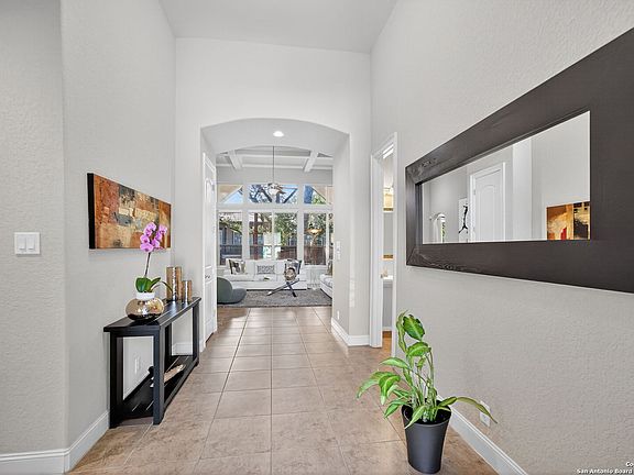 Welcome to this stunning 2,808-square-foot home nestled in the desirable, gated Two Creeks community within the acclaimed Northside Independent School District! Featuring 3 spacious bedrooms, 2.5 bathrooms, a dedicated study, and a formal dining room, this residence is designed for both comfort and style. Inside, you'll love the warm blend of ceramic tile, wood flooring, and brand-new carpet in the bedrooms. The chef's kitchen is a true centerpiece with granite countertops, stainless steel appliances, gas cooking, and an island with breakfast bar-perfect for everyday meals or entertaining. The open family room features a cozy gas fireplace, while the bay window in the primary suite creates a bright, inviting retreat complete with a large walk-in closet and oversized shower. Practical upgrades include a sprinkler system, gutters, garage door opener and a water softener. An oversized garage provides plenty of storage, and the covered patio offers a relaxing spot to enjoy your backyard. Located in Two Creeks, you'll enjoy access to a community swimming pool, sports court, and a secure gated entrance-all within Northside ISD. This home combines luxury with convenience. Don't miss your chance to own this exceptional property-schedule your showing today!