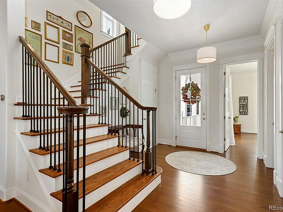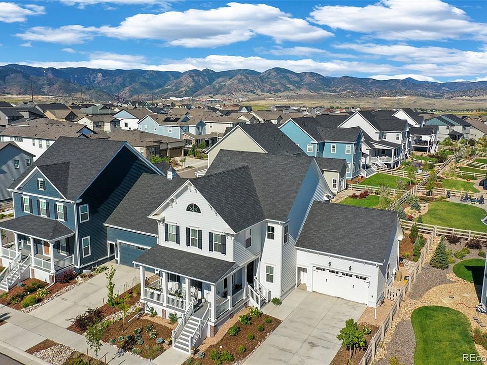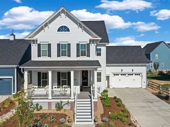 Beautifully designed by Parkwood, this Greek Revival Victorian home in Sterling Ranch offers everyday luxury! The gorgeous interior combines the character of yesteryear with modern amenities, spectacular mountain views, upgraded lighting, quartz countertops & designer finishes. 10' ceilings, stunning hardwood floors & elegant crown molding highlight the open concept main floor. Amateur gastronomists will delight in the gourmet kitchen that is equipped with a sizable island with seating, open shelving, a marble subway tile backsplash, abundant cabinet space with extra deep drawers, a walk-in pantry, stainless steel appliances (including a gas range with hood & double ovens)& a butler's pantry complete with a farmhouse sink & a beverage fridge. A handsome fireplace anchors the living room while the polished dining room opens out to the deck & the extensively landscaped fenced backyard for a seamless transition to outdoor entertaining. The main floor is completed by a stylish powder room & a flexible office space/formal dining room that opens to the wrap-around front porch. The light-filled upper level that hosts 2 bedrooms connected via a Jack & Jill bath, a built-in office nook, a convenient laundry room & the grand primary suite. The primary suite impresses with a tray ceiling, large walk-in closet & a luxurious 5-piece bathroom with a must-see free-standing soaking tub. Recently finished, the basement provides excellent additional living space with a fantastic wet bar, rec room, conforming bedroom & lovely full bathroom. Other noteworthy features include wiring for surround sound & a security system, a high Energy Star rating & smart home features including a Nest system & Rachio irrigation system. Wonderful location in a welcoming community with parks, trails, a clubhouse, an outdoor pool & a fitness center. Blocks away from Atlas Coffee, a brewery, a daycare & all the recreation opportunities found at nearby Chatfield State Park.