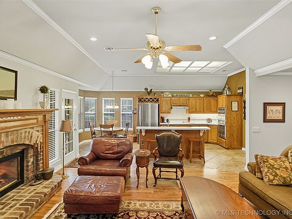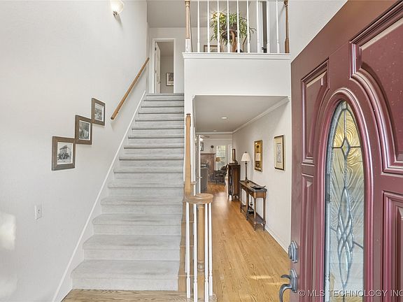 Welcome to this beautiful home in the highly desirable Jenks school district. The entryway greets you with a soaring ceiling and an airy brightness from the abundant natural light. You will love spending time outside in the tranquility and beauty of the backyard with the covered patio, large deck, hot tub, gardens, and water feature.