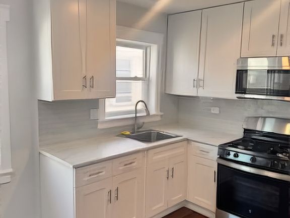 Stunningly renovated one bedroom. A must see! Be the first to move into this completely renovated top floor unit. Beautifully designed with a modern touch. Everything is brand new from the custom cabinets to the sleek stainless steel appliances, hardwood floors, countertops, sinks and faucets. The bathroom is a showstopper featuring marble floors and walls plus a deep soak tub that is perfect for relaxation. This home is ideal for someone who truly appreciates quality living! Please include your phone number in the application. Credit score and background check are required. Renter pays electric. All other utilities included. No pets allowed. Move in fee required.