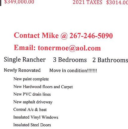 NEWLY renovated Rancher,Central air/heat,100 amp electric service,Hardwood floors, ModernKitchen and Bathrooms,Insulated vinyl windows,3 steel doors, Alarm system ready,ASKING PRICE 349,000.00