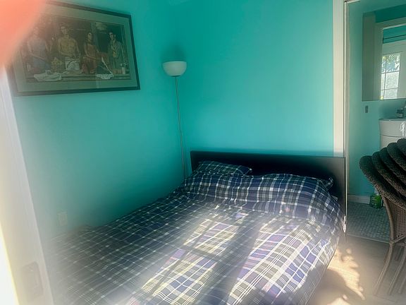 Airy furnished private room with its own entrance in the back of a house, with a vaulted ceiling. It has its own bath/shower and a queen size bed. It has a desk and a set of drawers, but no closets. The yard has tall privacy fence and is not easily accessible, but it is shared with the main house. The property has a washer and dryer in the garage, and a small fridge, no kitchen. It is similar to a private dorm room, but with a yard and a private entrance. This is a short term lease made available because of the LA fires. Renters will need to sign a four month lease, but can negotiate a longer lease depending on credit.