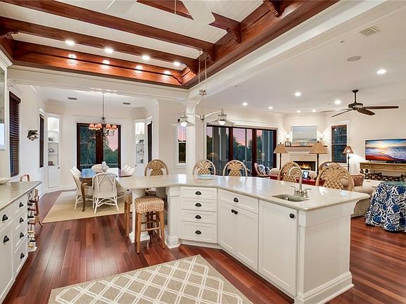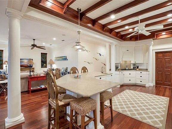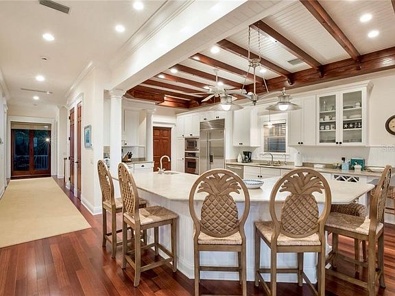 This classic Island Home offers a warm, casual elegance both inside and out, seldom found in a sought-after location like this. Marvel at the panoramic Gulf and Boca Grande Pass water views, from the spacious south facing upper level travertine terrace, one of five outdoor living spaces. You can also keep a close eye on the resident Osprey family whose platform is just 75 feet away. The historic Boca Grande Lighthouse is also part of the panoramic view! Constructed in 2006 by Island Design and Building, quality is evident throughout this well-appointed 4 bedroom, 4 bathroom family home, which also features a 3-car garage. Inside you will find beautiful Brazilian Cherry wood flooring, custom trims and crown molding throughout, solid wood interior doors, exquisite wood beam and beadboard ceiling treatments, tasteful built-ins, fireplace, gas cooktop in the kitchen, and a variety of beautiful hard surface countertops. Ascend to the spacious, top floor south exposure, light filled master suite, via either a finely crafted staircase, or the elevator which services all levels of the home. Minimal maintenance exterior design features include a metal roof, low maintenance siding and eaves, Ipe and travertine decking, a paver driveway, and impact glass windows and doors. A membership at the private world-class Boca Bay Pass Club is also a possibility with exceptional amenities just a stones throw away from this wonderful property!