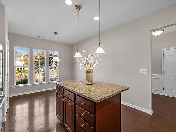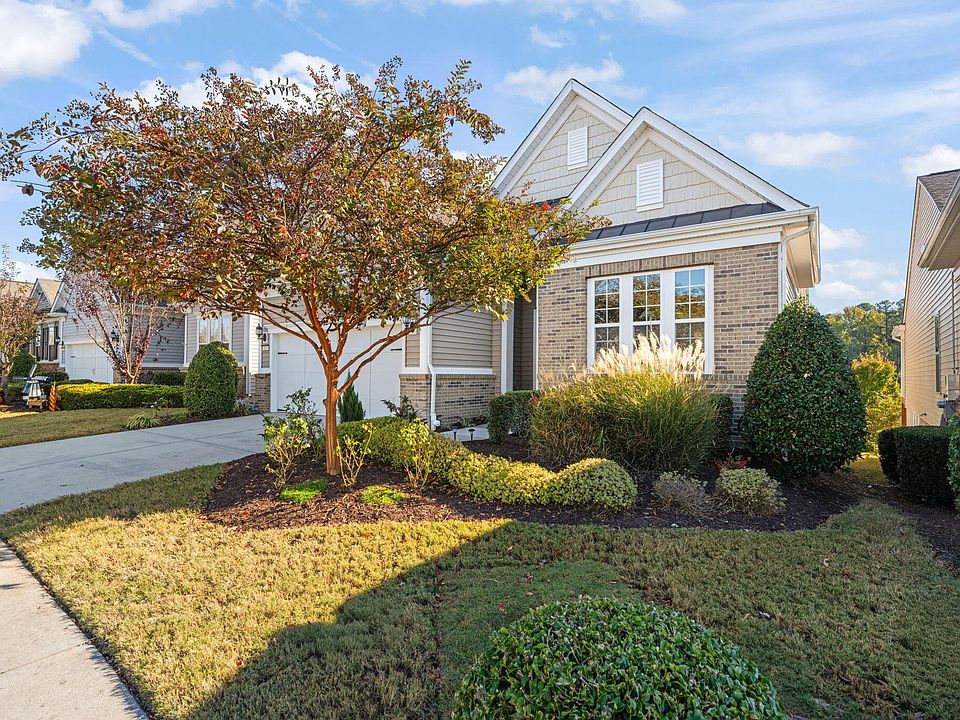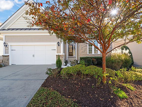 Looking for a house where you can easily live on the main level but want more space for family, visitors, hobbies, man cave, etc? Then this is the house for you! Hardwood floors & lots of fresh paint grace the main level. Gourmet kitchen with gas cooktop, ss appliances, pull-out sliders, granite counters, center island, tiled backsplash and large breakfast nook. The dining/living room combination features a cozy gas log fireplace and flows easily into the sunroom. The upper deck provides panoramic views! Primary bedroom suite boasts an upgraded tiled shower, dual vanities, and separate soaking tub. A guest room and bath plus an office complete the main level. The lower level with a walkout to the covered patio has a built-in bar area, large bonus space and two flex rooms/bedrooms plus a full bath. Need extra storage space or a workshop? Wait till you see the 39 x 29 unfinished area. The home features an energy efficient tankless water heater, 2 HVAC systems (2014 & 2022). Located in Cary's premier 55+ active adult community with world-class amenities including indoor & outdoor pools, pickle ball & tennis, full gym and loads of clubs.