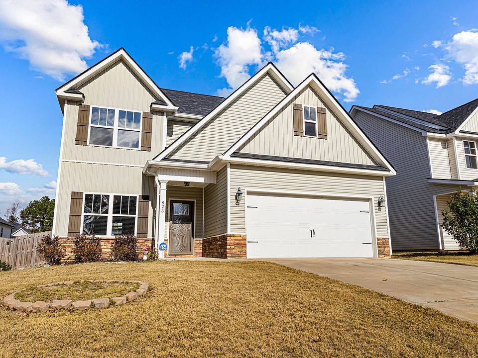 Excellent, move-in ready home in sought after Canterbury Farms! This 4 Bedrooms, 2.5 Bath home has what you have been looking for this Holiday Season! This home offer beautiful engineered flooring throughout the downstairs/living areas. The open kitchen boasts stainless steel appliances, granite countertops, huge island, double door pantry, and eat-in kitchen area. Large living room with coffered ceiling, stacked stone fireplace and shiplap wall. The spacious owner's suite offers a walk-in-closet, plus private bath with a soaking tub and separate shower. Other features include: blinds throughout, formal dining room also with coffered ceiling, covered back patio, privacy fenced back yard and 2 car garage.