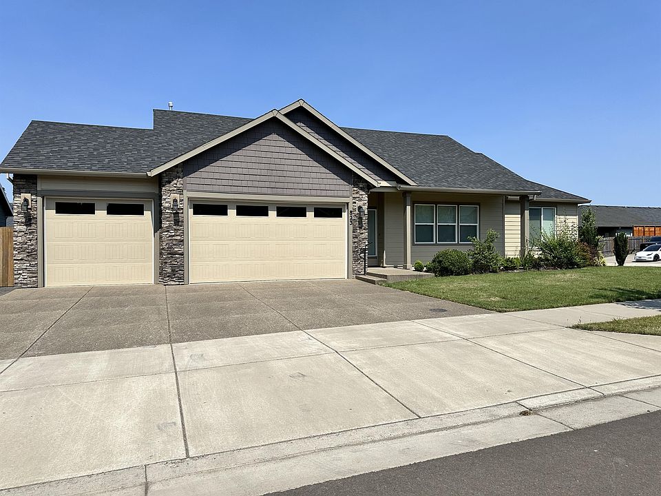 Like new, single level home with 3 car garage in Pioneer Village, Silverton. Large great room with vaulted ceiling and gas fireplace. Primary bedroom privately located on opposite end of other bedrooms. All kitchen appliances included. Washer and Dryer included. Fenced backyard, covered patio, gas BB. Tenant pays all utilities and responsible for landscaping.