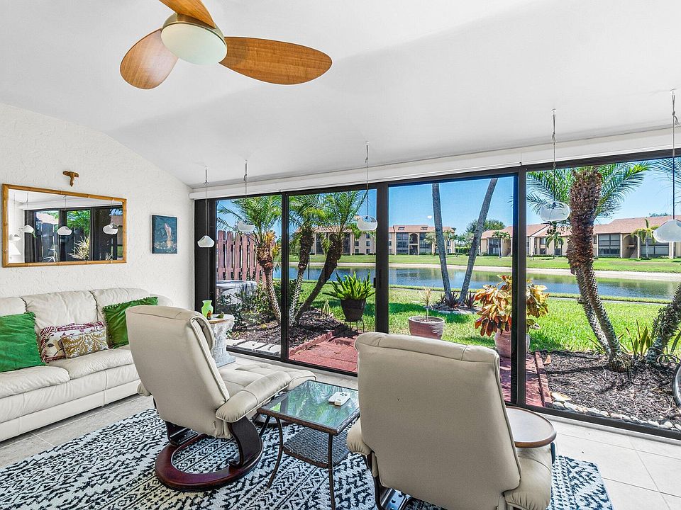 Charming Villa with WATER VIEWS! Tranquil water views from the living room, primary bedroom & Air Conditioned Lanai in this beautifully updated 2-bed, 2-bath villa. The open-concept floor plan features vaulted ceilings & natural light with Automatic Shades in Primary Bedroom & Lanai. The updated kitchen and baths, along with newly installed laminate flooring in the bedrooms, add a modern touch to this move-in-ready home. Entertain guests in the fenced courtyard patio, perfect for outdoor dining and enjoying Florida's sunshine. Amenities: Pickleball, Tennis, Heated Pool & Hot Tub, Bocce Ball & Clubhouse Flex occupancy with one 55+ & the 2nd can be 35+. 1 pet under 25 lbs allowed. Water & Cable included in dues. Close to Golf, Shops, Restaurants & more. New Roofs!