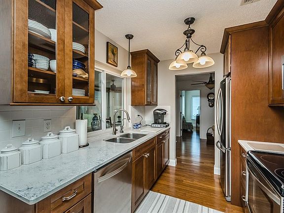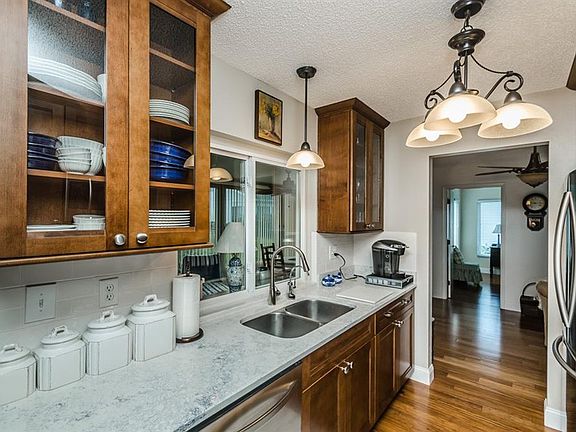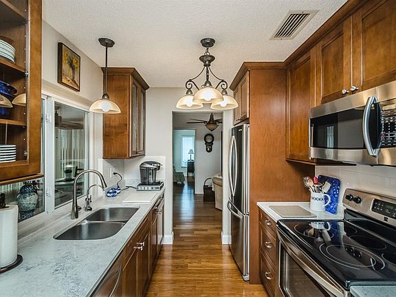 Welcome home! This gorgeous 2 bedroom 2 bath home with an enclosed Florida room screams out class at every turn. The entrance door features leaded glass inserts. As soon as you walk in you will notice the beautiful carbonized, stranded bamboo floors with the custom 5 inch woodworking. Typically this is seen in luxury homes. As you enter the kitchen you will be impressed with the quality of the quartz countertops, subway tile, walnut cabinets and the stainless steel appliances. The bathrooms are equally resplendent. Featuring granite countertops in the master and marble in the hall bath, you can see no expense was spared. Relax in the huge Florida room, or cook out on your slate patio. The AC is just over 1 year old and is a 3 ton, high efficiency Trane unit. Again, nothing but the best here! It's all ready for you! Schedule your private showing today! This amazing home will not last!