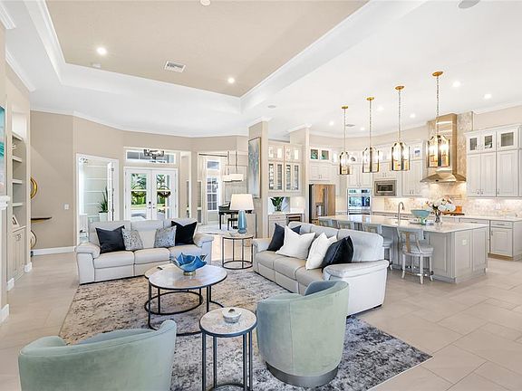 Perfection in Skye Ranch. This former Beacon model offers refined design and effortless indoor and outdoor living on a private preserve lot. Completed in 2020, the home features 4,541 square feet of thoughtfully curated space with soaring ceilings, a great room with custom built-ins and a fireplace, and an entertainer’s kitchen with an oversized island, built-in ovens, a walk-in pantry, and lit cabinetry. The main level includes a study, formal dining area, two en suite guest rooms, and an owner’s retreat with patio access, dual custom closets, and a spa bath with an oversized dual entry shower. Upstairs, a spacious game room with a wet bar and full bath adds flexibility for guests or recreation. Pocket sliders open to a resort-style lanai with pool, spa, and summer kitchen surrounded by peaceful preserve views. Features include impact windows, motorized shades, whole-home audio, three-zone HVAC, and a three-car garage. Located within the gated Cassia neighborhood, just minutes to top schools, Waterside, and Siesta Key.