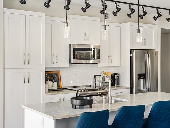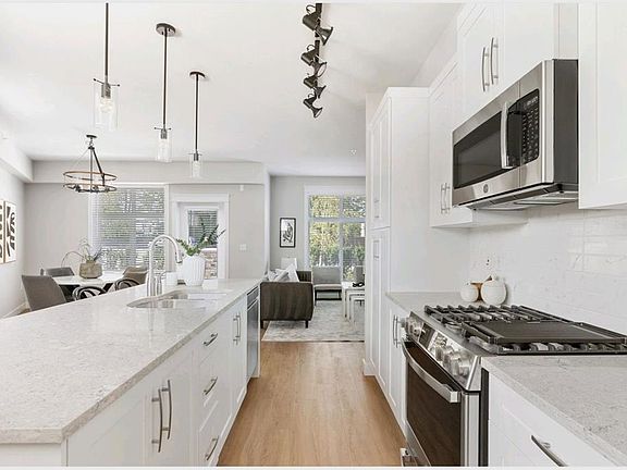 Ground-floor corner unitOversized windowsUpgraded oak-tone laminate floorsSleek kitchenQuartz countertopsAmple storagePrivate patio