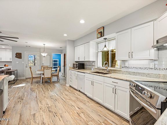 Beautiful home with a brand new roof on over an acre with stunning desert landscaping and more than 15 majestic saguaros creating a serene, natural setting. NO HOA! Inside, enjoy new flooring and plantation shutters throughout, offering a modern, airy feel and beehive fireplace. The updated kitchen features pull-out cabinet shelving, ample counter space, and stylish finishes—perfect for cooking and entertaining. The master suite includes a renovated bathroom with tile, and a marble walk-in shower. Additional bedrooms have walk-in closets. An oversized garage with an attached office or storage provides extra flexibility for work or hobbies. Step outside to a sparkling diving pool or above ground spa surrounded by desert beauty—an ideal retreat for relaxation and outdoor enjoyme
