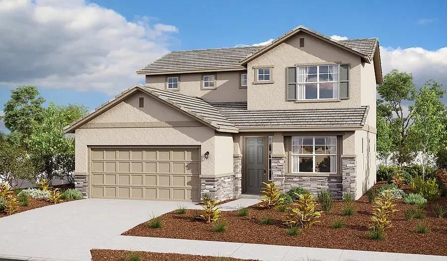 Luxurious features abound in must-see new home. The main floor offers an open layout showcasing a great room with a fireplace, a breakfast nook and a well-appointed kitchen, complete with GE® stainless-steel appliances, premium maple cabinetry, quartz countertops and a built-in pantry. An 8' sliding glass door leads to a covered patio right outside. There are three bedrooms upstairs, including an airy primary suite with a large walk-in closet and a private bath with dual dinks. Includes a 2-car garage.