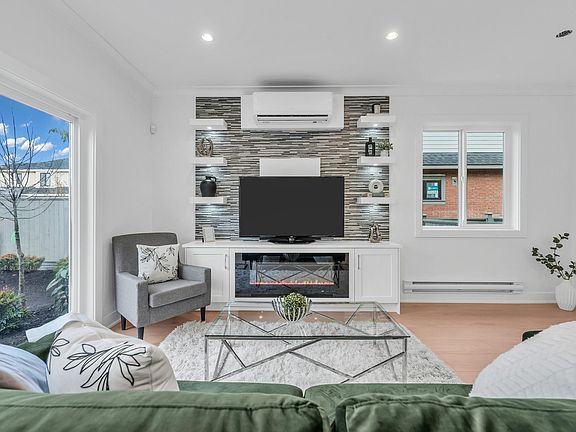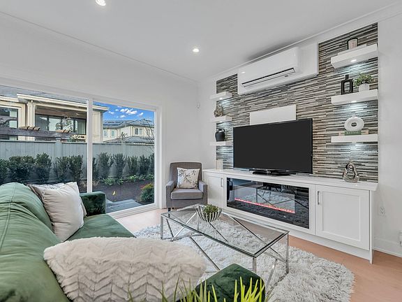 This modern 2-story townhome boasts high end finishes with abundance of natural light and a functional open floorplan. The gourmet kitchen features SS appliances, quartz countertops, and work island seating that is adjacent spacious dining room. The cozy living area features built-in entertainment cabinetry, under lit shelving with modern electric fireplace and contemporary wide plank laminate flooring. All generous sized bedrooms, with 2nd bedroom offering cheater ensuite bath and 3rd bedroom with study area. Complete with AC, HRV, Heat Pump, plus electric baseboard. DOUBLE car garage with EV outlet and more. Convenient central location close to both school levels, South Arm Community Center offering Pickleball & Tennis Courts, outdoor pool, and Athletic fields.