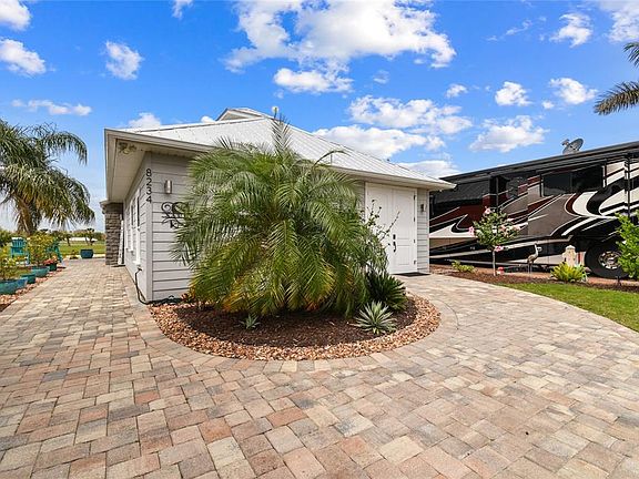 Experience refined living at Lot 93 in Thornton Creek Motorcoach Resort—an elegantly crafted custom casita that blends luxury, functionality, and breathtaking waterfront views. Every detail of this home has been intentionally designed to create a seamless flow between comfort and style. The heart of the casita is the main living area, featuring vaulted ceilings, a gas fireplace, and open access to the gourmet kitchen. Perfect for both entertaining and everyday living, the kitchen is equipped with granite countertops, high-end KitchenAid appliances, including a six-burner gas stove, built-in oven, microwave, dishwasher, and full-sized refrigerator. A peninsula with bar seating and a walk-in pantry enhance both practicality and visual appeal. Double doors lead into a spacious second living area with tray ceilings, a cozy couch, mounted TV, and built-in surround sound—a flexible space that connects effortlessly to both the bedroom and bathroom. The bedroom offers a private and serene escape with custom shutters, a built-in closet, and ample space for restful living. The bathroom was thoughtfully designed for both luxury and functionality, featuring an extended vanity with abundant storage and a glass-enclosed walk-in shower with bench seating. It also connects directly to the air-conditioned garage, which offers flexible use as a golf cart bay, office, or additional storage. A stackable washer/dryer and built-in closet system add further convenience. Step outside into the 375 sq. ft. screened lanai, where motorized Kevlar hurricane screens allow for year-round enjoyment and smooth transitions between indoor and outdoor living. With space for both seating and a fire pit, this area flows out to a spacious pavered patio, surrounded by tropical landscaping and palm trees. The patio offers additional space for grilling, dining, and soaking in tranquil water views and the adjacent golf course’s driving range. From its high-end finishes to its thoughtful layout, Lot 93 is a standout property—ideal for those seeking elegance, practicality, and the full Florida lifestyle. Schedule your private showing today and experience resort living at its finest.