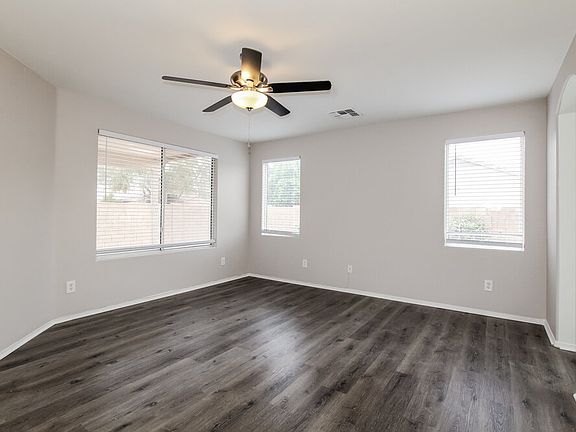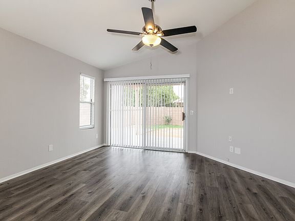 Southwest architecture meets modern features in this four-bedroom, two-bedroom renovated rental home in Phoenix. Luxury laminate flooring and a ceiling fan provide year-round comfort in the living room. This airy space flows into the dining area, which offers a glass and chrome chandelier and patio doors for dining outside on the concrete patio in the fenced backyard. In the kitchen, a center island facilitates meal prep, and brand-new stainless steel appliances make cooking a breeze. A walk-in wardrobe will keep you organized, and the master suite also includes a ceiling fan for comfort. The suite's sparkling bath features a marble vanity with new lighting and a relaxing soaking tub. Be sure to visit this renovated Phoenix rental home soon!