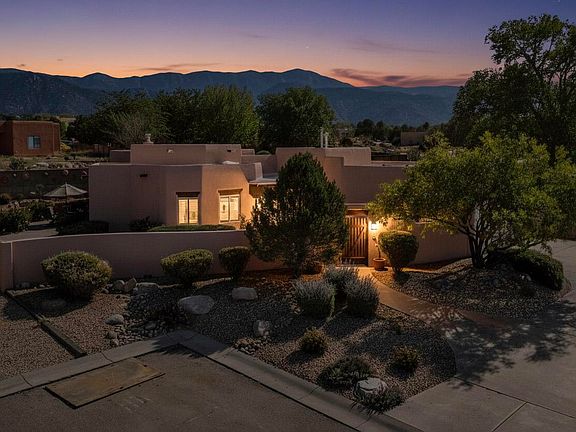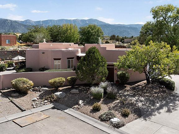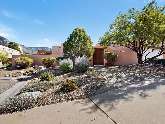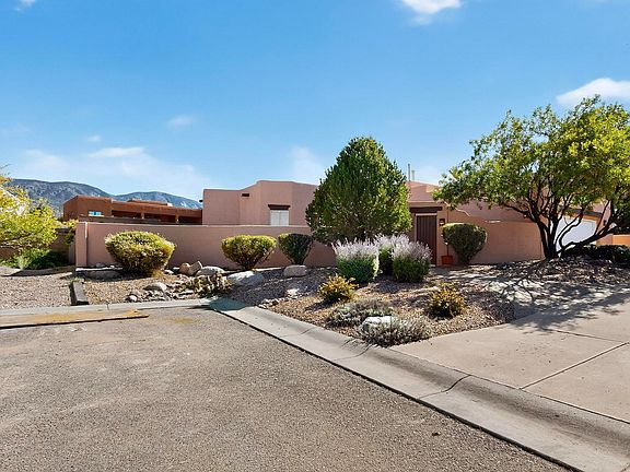 Set on a spacious cul-de-sac lot, this elegant Scott Patrick home in Sandia Heights welcomes you through a private courtyard entry framed by vibrant rose bushes in both the front and back yards. Inside, the living, dining, and kitchen areas are thoughtfully arranged around a stunning Pueblo-style great room, where exposed wood beams, a warm gas fireplace, and expansive windows capture breathtaking views of the Sandia Mountains--an ideal vantage point to watch the peaks shift in color throughout the day. The chef-inspired kitchen features stainless steel appliances, granite countertops, and a generous island, offering an open and inviting space perfect for both cooking and entertaining. The primary suite provides a serene retreat with its own gas fireplace, a luxurious spa-like bath and a