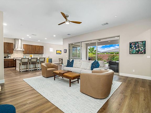 Experience resort-style living at its finest in the gated 55+ community of Trilogy Polo Club with this highly upgraded Proclaim model showcasing 3 bedrooms plus den/office, 2.5 baths, and approximately 2,141 sq. ft. of beautifully designed living space. This residence features an open-concept floor plan filled with natural light, seamlessly blending indoor and outdoor living through expansive sliders that open to a covered paver patio, perfect for entertaining or relaxing against the backdrop of the Santa Rosa Mountains. The chef's kitchen is a true showpiece with upgraded cabinetry, quartz countertops, stainless steel appliances, and an oversized island with seating, flowing effortlessly into the great room and dining area. The primary suite offers a spa-like retreat with a granite dual-sink vanity, chic tiled shower, and spacious walk-in closet, while two guest bedrooms share a stylish bath. Additional highlights include a powder room, golf cart garage, laundry room with a sink, luxury vinyl plank flooring, ceiling fans, custom California closets in the bedrooms and garage, solar, and numerous upgrades throughout. Residents of Trilogy Polo Club enjoy an exceptional array of amenities, including a modern clubhouse with a restaurant, fitness center, resort and lap pools, tennis, pickleball, golf simulator, poker/billiards room, culinary and art studios--all designed to elevate the desert lifestyle.