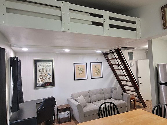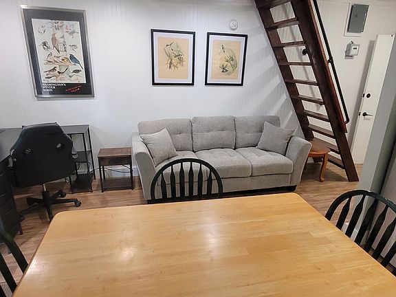 Quiet, peaceful, fully furnished and newly renovated studio unit attached to home with private, separate entrance in Tumwater Hills neighborhood. Includes a full kitchen (full fridge and microwave, gas range, quartz countertops), loft with queen bed, separate bathroom and walk-in laundry closet (with full size washer and dryer). Unit includes a 50" smart TV and dedicated work space. Enjoy the spacious (8'x20') covered deck overlooking a large fenced backyard. That's not all - park your car in a shared garage with remote opener with extra storage area! The loft sleeping area is comfortable but cozy with "ship ladder" access. It is built to OSHA standards (# steps, angle, width, etc.) with handrails, but may not be ideal for those who are uncomfortable with these type of steps and low overhead space. If you would like a tour, please tell us a little about those renting for the safety of current tenants (employment, vehicles and number of applicants and anything else of note). Very competitive flat monthly fee of $150 for all utilities based on historical averages - electric, water/sewer, garbage, and excellent internet signal. Tenant will be asked to report electric sub-meter readings to landlord upon request (typically first day of the month). Terms: lease duration flexible - 1 to 12 months. Maximum occupancy two people. Fully refundable security deposit of $1200. One vehicle is ideal though a second vehicle could be accomodated with on-street parking. No more than two vehicles total. Sorry - no pets. Smoking ok outdoors and on deck. The unit is in the heart of a residential neighborhood with working people and families, so this is not a place for parties, though low-key socializing is welcome. Quiet times apply between 8am and 8pm, particularly as we head into the autumn/winter months. The neighborhood is very walkable (expecially if you like hills!) with many sidewalks and is close to shopping and countless restaurants in both West Olympia (Trader Joes and Haggen are 4 minutes away) and Tumwater (Costco, Walmart, Fred Meyer are 7 minutes away). Within walking distance to beautiful SPSCC campus.