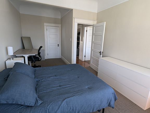 Room for rent has a queen bed, desk, chair, dressers, brand new bed sheet/comforter set, pillows, mirror, lamp, trash bin, hamper, and other amenities that complete the room.