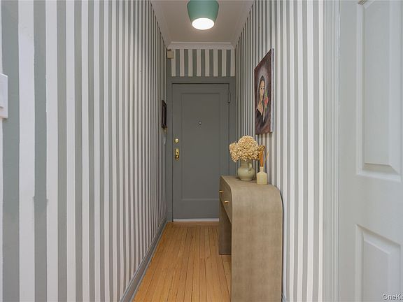 Welcome home to your private oasis in Bronxville Ridge, a desirable pre-war cooperative complex in Bronxville P.O. Ideally situated just around the corner from the Fleetwood Metro North station, this spacious, perfectly appointed 2 bedroom, 1 bath apartment has all the bells and whistles, and is just waiting for you to call it home. Seemlessly blending the old with the new, this home features charming pre-war details, including high ceilings, hardwood floors, graceful archways, and decorative crown moldings, but has been updated to today's discerning buyer's exacting standards. The chef's kitchen has been beautifully renovated, sporting crisp, solid-wood white cabinets with solid brass hardware; high-end appliances, including a Kucht professional grade gas range and hood vent, Bosch dishwasher, and Kitchen Aid refrigerator; copper sink; porcelain tile backsplash; and quartz countertops. The recently updated bath features a stylish marble floor and ceramic tile bathtub surround, sleek light fixture and recessed medicine chest, deep soaking tub, and Signature Hardware fixtures. The living room has southern and eastern exposures, allowing for an abundance of natural light. The focal point is the wood burning fireplace, perfect for cozy gatherings around the fire. Adjoining the living room are a bonus room with exposed brick that is separated by French doors and is the perfect space for a home office or exercise area, and the dining area, which features hand-painted stencil walls and has room for table that seats 4-6 people. The primary bedroom sports raised panel moldings and a large, lighted custom closet. Across the hall is the second bedroom, with two exposures. Additional upgrades throughout the apartment include new light fixtures, new hardware on all the doors, recently refinished hardwood floors, a Ring doorbell/