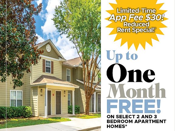 - Special offer! Up to One Month Free on Select 2 and 3 Bedroom Apartment Homes.* For a Limited Time, App Fee is only $30!* *May be subject to being split over three(3) full months of residency. Must move in by 12/12/25. Restrictions apply, contact leasing office for details.