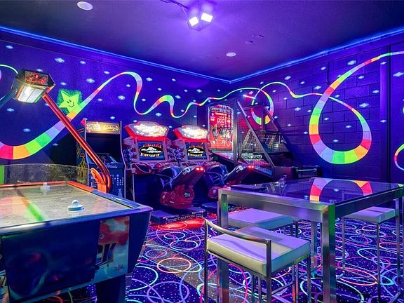 The Magical Estate is a 5 bedroom (all en-suite), 3,200 sq foot treasure that features countless activities for all ages! The private pool/spa and spacious pool deck include plenty of lounge chairs and countless games and activities. This includes pool basketball, cornhole, and larger-than-life ConnectFour! The outdoor kitchen and oversized dining/seating include an outdoor TV, the on-site Las Vegas-themed casino, and a lounge for adults featuring poker and token-based slots. the state-of-the-art arcade and game room, the next-level wizard, and superhero-themed rooms including 3 different commercial playground quality slides, and an unparalleled pop art collection that fills the walls, are just a few of the features that set this home apart! There’s even an on-site laundry room with brand-new machines for your convenience. The large Master bedroom includes an oversized soaking tub and overlooks the crystal-clear swimming pool, as well as a nature preserve from its private balcony; the Hollywood-themed room brings comfort, class, and glamour to the most discerning of guests. The edgy character room includes luxury design and contemporary vibes infused with unique pop-art interpretations of the world’s most famous mouse; the superhero room includes custom-built bunk beds, a tube slide, mind-blowing wall murals, and an authentic 7-foot tall superhero statue; and the wizard room includes a custom-build castle bunk-bed set-up, double slides out of the top bunks, epic wall murals, custom lighting and more! The amazing game room includes basketball, air hockey, side-by-side racers, a multi-cade, and multiple video game consoles. Given the large home and the limitless features, this is a fantasy land for travelers of all ages. Golfers on an adult-only golf trip and/or those in search of a quiet, luxurious getaway will enjoy just as much as 2-3 families traveling together with their kids in search of a fantasy land of activities. The Magical Estate is your home away from home!