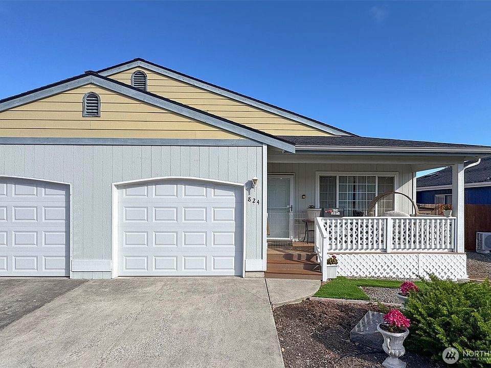 Duplex style condo with just one shared wall, and exceptional light with southwest exposure and partial mountain view;this unit has three full bedrooms with closets. Open kitchen with newer appliances. Energy efficient heat pump and AC. Covered front porch deck, side deck and rear patio with private "AstroTurf" fenced area for low maintenance or small pets to enjoy. This convenient, well maintained complex of just 12 units is close to shopping and just a short walk to Carrie Blake Park, and the Olympic Discovery Trail. A short drive to Port Williams beach, and John Wayne Marina. Easy access to town and all amenities! Spacious garage with plenty of room for parking and storage. Reasonable HOA fees cover landscaping and exterior maintenance.