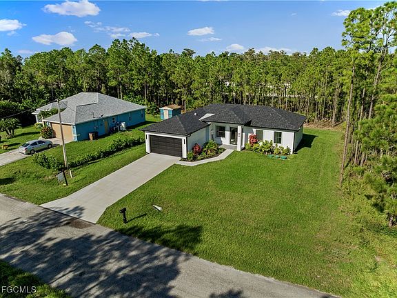 Welcome to this MAGNIFICENT (2025) BUILT completed 3/2+ DEN home nestled away on a QUIET street close to 82 highway. This GRAND elevation with DOUBLE front doors & flattering tile entrance along with high ceilings & 8ft MODERN flush panel interior Doors spotlights an impressive OVERSIZED porcelain tile throughout, gorgeous QUARTZ rainfall countertops & backsplash with an inviting attractive SHIPLAP breakfast bar, STAINLESS STEEL appliances, and SOFT CLOSE SHAKER cabinets with crown molding. It is nicely landscaped and highlights IMPACT WINDOWS & DOORS, outstanding TILED walk-in showers with FRAME-LESS glass doors plus built-in niches, brilliant soffit lighting, awarding dual sink vanities, and dazzling premium fixtures. It also features pendant & recessed lighting, a built in cabinetry pantry, generous dual closets in master, a Laundry vanity sink, and an awarding tiled back patio great for entertaining. This property is NOT IN A FLOOD ZONE just minutes from all major amenities & a quick commute to Fort Myers! Schedule your showing today!