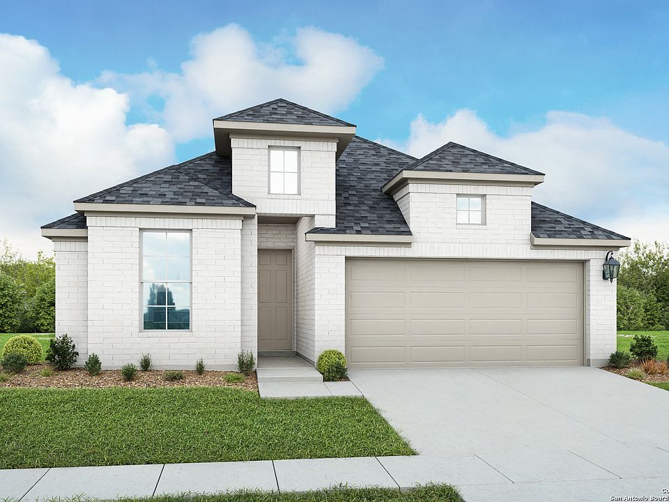 Welcome to the Aruba plan in the Clear Creek community of New Braunfels. This inviting home offers a brick exterior, three bedrooms, two bathrooms, an extended covered patio, and a dedicated study that provides flexibility for work or relaxation. The kitchen is designed for both style and function with a center island and sink, engineered marble countertops, forty two inch wood cabinetry, a spacious corner pantry, and a ceramic tile backsplash. The owners suite is a comfortable retreat featuring a ceramic tile shower, dual sink vanity, a private water closet, a linen closet, and a generously sized closet. The laundry room includes built in shelving for added convenience Clear Creek residents enjoy direct access to the access road near Interstate thirty five, making daily commutes easy. The community is also close to many local attractions. Downtown New Braunfels offers boutique shopping, local dining, entertainment, and year round events. Lake Dunlap provides a peaceful place for fishing and water activities, while Canyon Lake is ideal for enjoying scenic views and outdoor adventures. The nearby Gruene Historic District is a lively destination known for live music, special events, and the iconic Gruene Hall.
