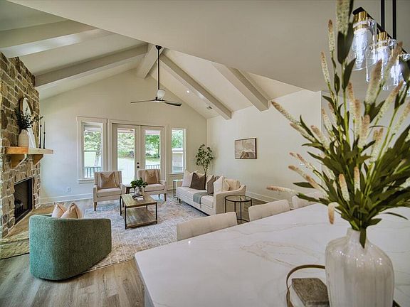 ceilings with striking wood beams and a charming stone-faced fireplace—ideal for cozy evenings or entertaining guests. The heart of the home is the modern