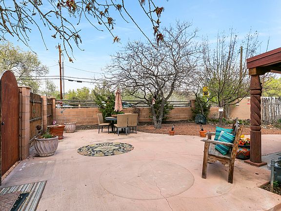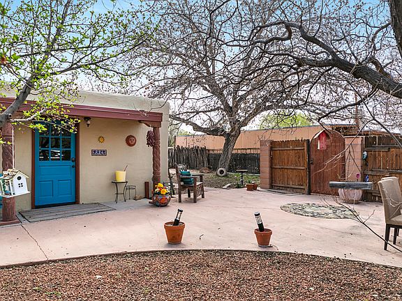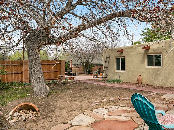 Live in the serenity of Los Ranchos in this beautiful adobe home beneath the trees. The fully fenced property brings privacy and lots of outdoor space to enjoy gardening, entertaining, or your morning coffee with nature. Inside, you'll find timeless brick floors and beamed ceilings. The kitchen comes with all appliances! The bedroom suite has attached bathroom with large shower and water closet. The home is heated and cooled with two mini split units for added comfort. Enjoy the outdoors with access to trails for walking or biking, access to Rio Grande and the Bosque nearby!