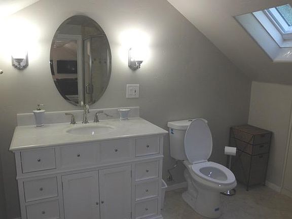 Travertine bathStainless appliancesDining nookGranite countertopsUnder-eaves storageHardwood floorsFull-sized washer and dryer