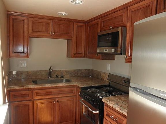 Kitchen: Stainless appliances: range, microwave, & refrigerator.