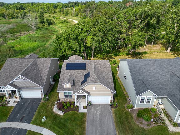 FREAKIN FANTASTIC opportunity to DOWNSIZE without needing to get rid of your prized possessions with this Rare FULL BASEMENT home on cul-de-sac in this 55+ Briargate clubhouse community. Gourgeous RANCH Home with 2 - 3 BEDROOMS & 2 FULL Bathrooms, Open Floor Plan and 10' Ceilings. Beautiful Kitchen with Stainless Steel Appliances, Granite Countertops, Large Island & 42" Cabinets. Kitchen opens to Dining Room, Sunroom and Living Room with gas fireplace & mounted Large Screen TV. Huge Low Maintenance Deck the entire width of the house overlooks Lake County Forest Preserve with access to the Millenium Trail. Durable Luxury Vinyl Plank flooring throughout main floor. Office has glass paneled double doors and could serve as a 3rd Bedroom. The Primary Suite with a view has spacious Bathroom with Tub, Separate Shower, Double Sink Vanity & Walk-in-Closet. 1,800+ SF Basement for Storage or finish for additional living space. The Solar Panels are OWNED to reduce electric bills & 2 Car Garage has 220 Volt Outlet for EV Charging. e-fireplace in 2nd Bedroom, RING camera and Landscape Lighting included in sale. Lawn care and snow removal included in very reasonable monthly assessment. This one is worth moving for.
