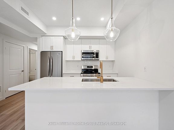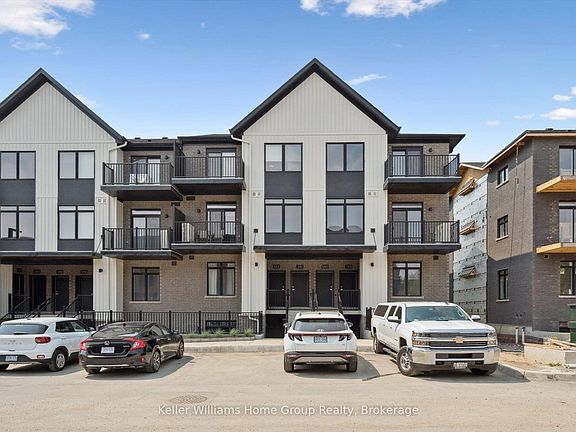 Move-In Ready End Unit at Northside Quick Closing Available! Ready for immediate occupancy, this terrace-level end unit in Guelph's sought-after Northside community offers the perfect blend of style and convenience. With 900 sq. ft. of thoughtfully designed living space, it's ideal for anyone eager to settle in without delay. Built by award-winning Granite Homes, this stacked townhome features 2 spacious bedrooms and 2 modern bathrooms, complemented by 9 ft ceilings, luxury vinyl plank flooring, elegant quartz countertops, and a complete 6-piece appliance package. Step outside to your private outdoor terrace, perfect for enjoying your morning coffee or winding down in the evening. You will appreciate the convenience of having your very own exclusive storage room, which is included with this home. Situated beside the SmartCentres plaza in North Guelph, you're just steps from grocery stores, restaurants, shops, Riverside Park, scenic trails, and public transit including the 99 Express route to Downtown and the University of Guelph. Northside is designed for easy living, with a community park, outdoor amenity area, and offers flexible parking options for one or two vehicles. Photos with furniture have been virtually staged.