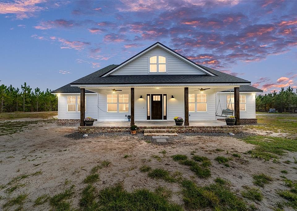 Beautiful Home Completed 2022! 3 bed/ 2 bath plus a Flex room on secluded 11.17 acres of land in Bradford County. As you enter the crushed stone drive you will notice planted pines throughout the property. This beautiful home has an open floorplan with cathedral ceilings and luxury vinyl plank in the main living area, black hardware and light fixtures throughout. The gourmet kitchen includes solid wood cabinets granite countertops and ample size pantry. The laundry room has plenty of room for a functional work space. Enjoy the cozy gas fireplace and large living room with a flex space nearby that can be used as a separate dining area, office or workout space. The primary bedroom has a fully tiled ensuite bath and includes a soaker tub and shower along with a duel vanity. Enjoy the wildlife from your front porch that runs the full length of the home and feel secure knowing your home is covered in Hardie plank cementitious siding and duel pane windows throughout. You get this beautiful 2022 built home without the wait! Minutes from shopping and dining and approximately 30 minutes to Gainesville and Lake City.