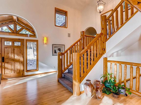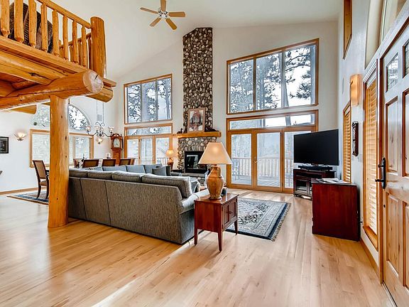 Welcome home to this Prestigious Golf Community with Large Wooded Lots and Scenic Red Rock Outcroppings - truly Colorado Living at the foot of Pike National Forest. This Home Exudes Warmth with Floor to Ceiling Windows, Exposed Log Beams and Rock Fireplaces (Indoor/Outdoor). Boasting Custom Features of White Maple Hardwood Floors, 42" Maple Cabinets, Granite, Gas Range, Glass Block Shower & 3 Extensive Composite Decks featuring a Southern View. Drive your Personal Golf Cart to the Private Perry Park Country Club - this Amazing Lifestyle will be yours since the home is Low Maintenance with Stucco/Rock Exterior and very Natural Professional Landscaping. Entertain in the open Floor Plan with the Great Room, Dining Area and Kitchen with Center Island all Opening to the Outdoors. The Walk Out Basement features Wet Bar with Granite Counters, Wine Fridge and Beverage Fridge, Flex Space for a Bedroom (Non-Conforming) 2nd Office or Exercise Room. Dramatic Log Loft for Office/Den Upstairs.