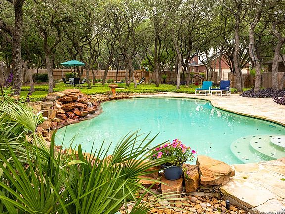 Welcome to 8245 Jamestown Sq, an exquisite single-story residence nestled on a generous 3/4 acre lot, enveloped in the tranquility of mature oak trees and lush ivy in Boerne, Texas. This 3,458 square foot, 4 sides brick exterior sanctuary boasts a meticulously designed split-bedroom layout that includes four bedrooms and three full bathrooms, offering both privacy and functionality. The heart of this home is its over-sized primary suite, a true retreat featuring a cozy sitting area with a gas fireplace, creating an ambiance of warmth and relaxation. The adjoining five-piece bathroom is complete with a spacious walk-in shower, separate soaking tub, dual vanities, and a large walk-in closet with built-ins for ample storage. The fourth bedroom is currently being used as an office and can be utilized in either capacity. Entertaining and family living are a delight in the expansive family room, where tall ceilings and a second fireplace set the stage for memorable gatherings. The kitchen features granite countertops, freshly painted cabinets with new hardware, and a large walk-in pantry. Adjacent to the kitchen, a formal dining room awaits, ready to host dinners and celebrations. Perhaps the most enchanting feature of this home is the huge screened-in back patio, overlooking a stunning oasis-like pool with a waterfall, ideal for dining or simply soaking in the serene views. The pool area, surrounded by decking and a built-in BBQ, is perfect for those Texas summer days and nights. This home is situated in a coveted gated community, offering amenities such as a pool and walking trails, and is located on a quiet cul-de-sac, ensuring privacy and peace. The large circular driveway and side-loaded garage provide ample parking for guests, while the recent updates, including a roof only three years old, ensure a worry-free lifestyle. With its proximity to both Boerne and San Antonio, BISD schools, the RIM, La Cantera, shopping, and dining, 8245 Jamestown Sq represents the perfect blend of quiet country living and convenient city access. Discover your dream home in this idyllic setting, where luxury meets comfort and style.