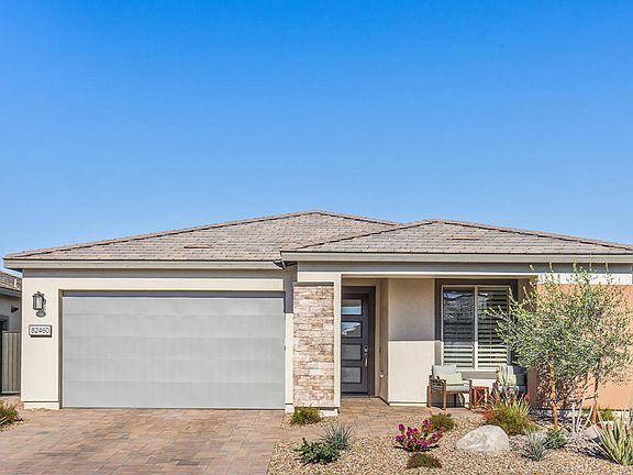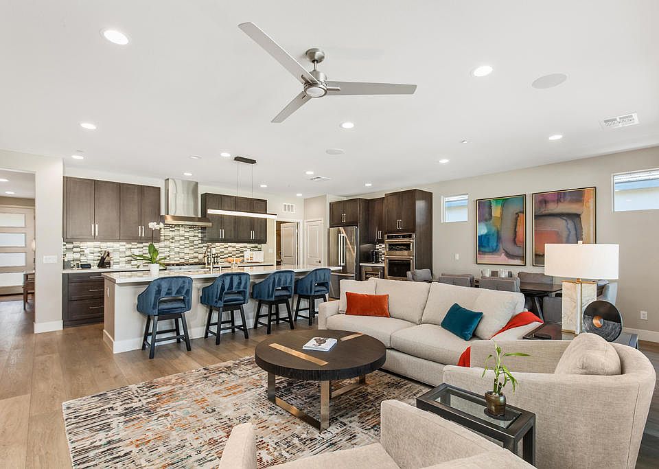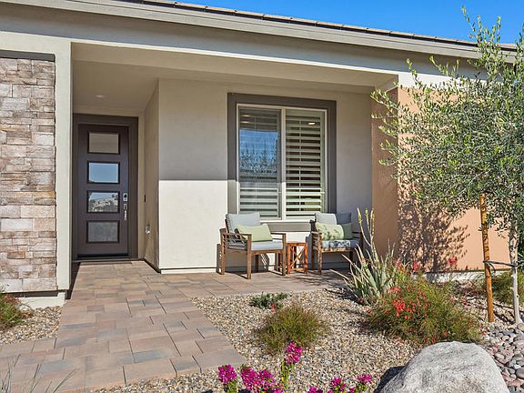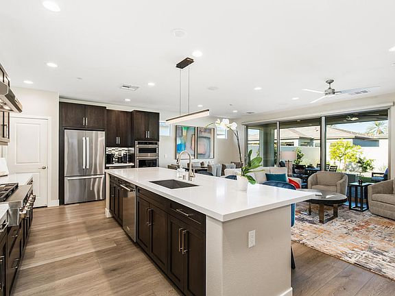 This Connect plan is Meticulously kept and offered designer furnished. Features 3 bedrooms, 2 baths plus an office with custom murphy bed for extra guests. This floorplan lives large in a layout that perfectly fits your lifestyle. The open concept floorplan features an inviting kitchen with a spacious island, quartz countertops, custom design tiled backsplash, shake style cabinetry w/pull-out drawers, LED kitchen island pendant, chef kitchen with stainless steel top of the line Kitchen Aid appliances, gas range with hood, built-in microwave, large farm sink, wine refrigerator and don't forget a spacious pantry. The large family room and dining room boasts a wall of slider glass door windows, custom electric window covering and custom slider screen, enjoy watching TV above the designer-built gas fireplace with speakers in ceiling and sand bar. The serene primary suite with custom electric window coverings, fan and tranquil lighting to set a nice mood plus an ensuite bathroom featuring a large upgraded tiled walk-in shower with bench, upgraded shower doors, double vanity with gorgeous lighting above the custom mirror and large walk-in closet. Retractable shade to cover the patio area creating an outside room. The serene backyard gets a lot of sun, landscaped designed beautifully and has a sitting area to watch the sunset every day. The owner spared no expense on her upgrades, tankless water heater, water system, garage a/c, Solar and much more! Call for a private showing.