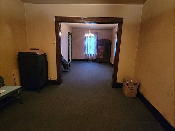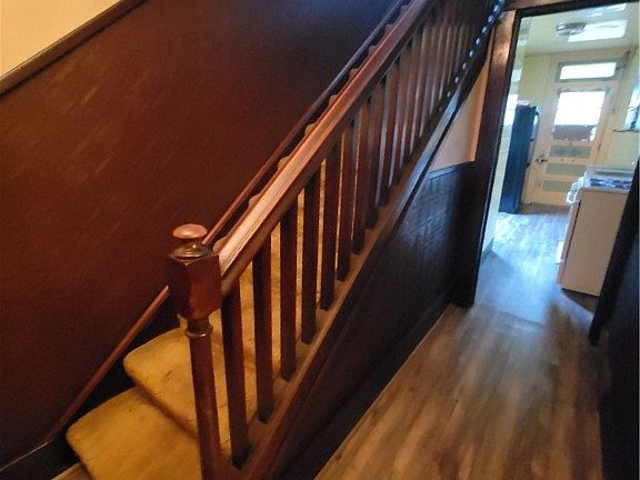 in all the hallways and staircase and laminate flooring. Classic light deco light fixtures in hall, Living, & Dining. Open Living room/Dining Room is 29 feet long, with a dining room bay window. Older galley ktichen with newer Frig and Stove. Upstairs bedrooms are older tile & classic linoleum. Bath with tub/shower. Large panelled attic is 30 x 10, a potential family space. Full basement with enclosed potty, washer/dryer, Laundry tub, under porch storage, electric breaker panel box. Rear porch (breakfast size) overlooks large yard with storage shed. Yards back on to unused alley. Home needs updates, paint, floor coverings?, but is move in ready for you to make your own.