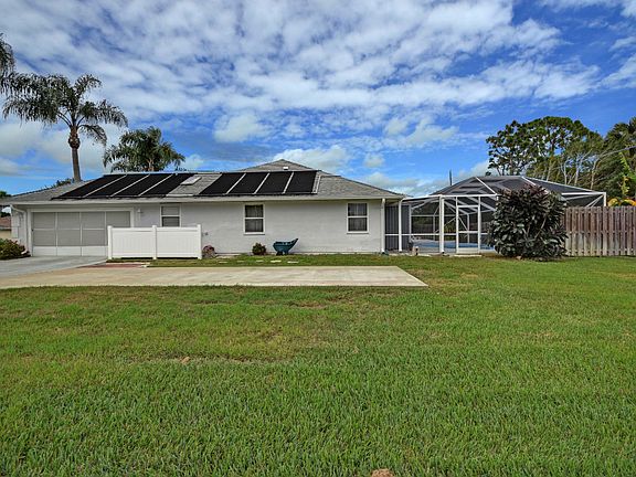 Sebastian 3 bed 2.5 bath with screen enclosed, East facing salt water pool ( 16 x 32 ) with solar heater. Large covered lanai with outside shower and 1/2 cabana bath. Freestanding 4 person electric hot tub on pool deck. Spacious, private double lot with RV / Boat pad that measures 39 x 12. 20x18 metal workshop on concrete pad with 220 electrical and window AC. Newly fenced side yard. City water with a well for sprinkler system. Nicely landscaped. Newer septic drain field. Tiled flooring throughout. Vaulted ceiling entryway and family room. Family room double pocket sliding doors open to lanai for Florida indoor/outdoor living. Separate 2nd master bedroom floor plan for privacy. Newly painted inside and out.