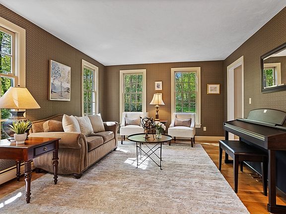Gracious Colonial tucked away on nearly 3 serene acres on a private road shared w/ upscale homes. At the heart of this special home is a center island kitchen w/ abundant cabinets, granite counters & gas cooking seamlessly flowing into a dramatic family room w/ soaring ceiling & a cozy fireplace w/ efficient wood insert. Savor verdant views through oversized windows while entertaining in the formal living & dining rooms. Unwind in the primary suite w/ walk-in closet & full bath w/ soaking tub. Host large gatherings in the stunning, sun-filled 2nd floor bonus room graced with gorgeous wide pine floors & soaring ceiling. Step outside to your private sanctuary—enjoy basking in the heated inground pool and hot tub, lounging on the expansive patio or deck overlooking a sprawling lush landscaped yard – ideal for summer fun & avid gardener. Enjoy convenient 1st floor office & expansion potential in the unfinished lower level. A truly special home offering privacy, beauty & room to grow!
