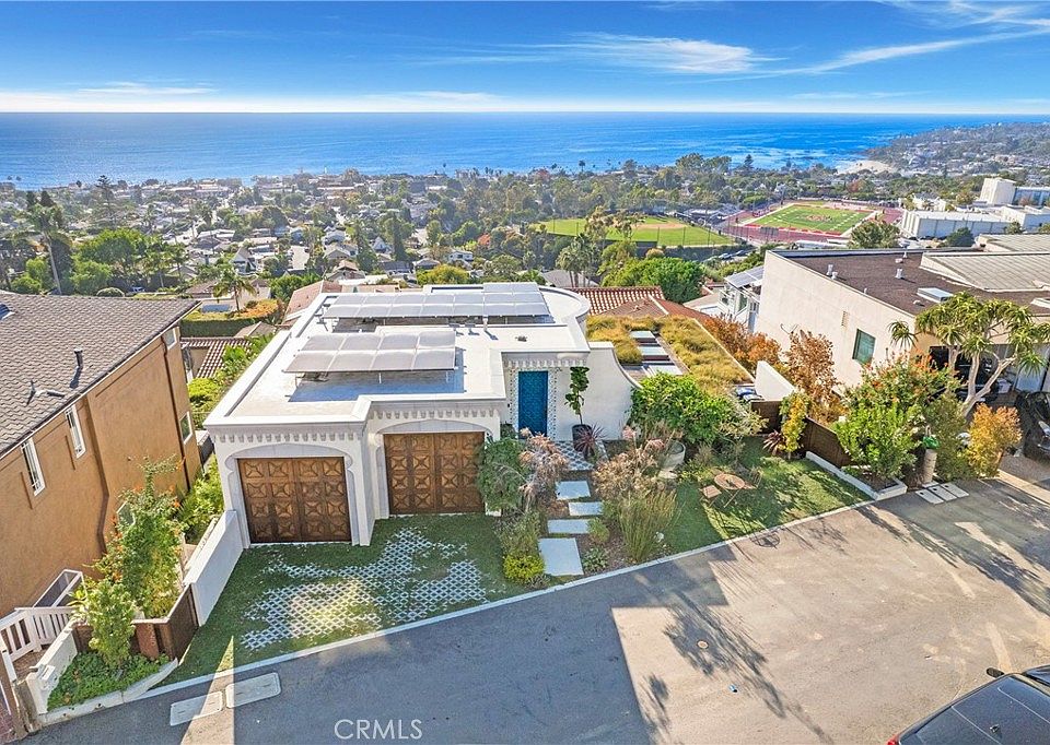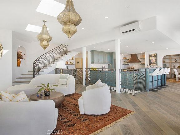 Incredible opportunity for this stunning ‘newer’ construction residence, perfectly positioned to capture panoramic ocean views & offering a wonderful blend of contemporary design with Moroccan-inspired elegance. Designed to maximize indoor/outdoor living, the residence offers multiple outdoor spaces perfect for year-round enjoyment. Enter at street level & be drawn to breathtaking views of the ocean, Catalina Island and Main Beach Laguna through oversized picture windows. The ‘retreat style’ Primary suite crowns the top floor and features a fireplace, spa-like ensuite with walk-in shower, freestanding tub & balcony to enjoy panoramic views. The main level, accessed by a graceful curved staircase adorned with custom ironwork & hand-blown glass by a local artisan, is designed for entertaining. Hardwood oak flooring, smooth stucco walls, and Moroccan-inspired light fixtures create a space with skylights and a fireplace clad in handmade Zellige tile. The bright living area opens through French doors to a spacious ocean-facing balcony. The adjacent chef’s kitchen impresses as the centerpiece of the main living space with leathered soapstone countertops, copper accents including hammered range hood & farm sink, a 48” ILVE range, walk-in pantry, prep sink, and generous counter space make this kitchen both functional and beautiful. A unique library/den space off the main living includes a bespoke fireplace with mosaic tiles and carved wood surround, custom millwork, and an ocean-facing bay window seat offering a perfect spot to relax while enjoying the view. This space could also serve as a home office or bedroom, with ensuite access to a full bathroom. A main-level bedroom affords the option as a primary suite with walk-in closet and ‘Jack & Jill’ bathroom featuring a soapstone vanity, dual copper sinks, and custom tiled shower. On the lower level, a 3rd bedroom with ensuite offers a private oasis, with outdoor access to the secluded covered patio/sundeck with Arto tile flooring, Zellige tile fountain, gas fire-pit, custom mosaic ‘art’ wall, fruit trees, herbs, seasonal Morel mushrooms & vibrant, water-wise landscaping. No detail has been overlooked in this exceptional home, incorporating eco-conscious features such as owned solar power, two EV charging stations, extra-dense insulation, a green roof and ductless mini-split systems for energy-efficient climate control. This residence offers an unparalleled opportunity to experience coastal living at its finest.