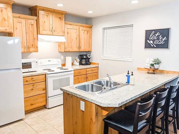 - Kitchen features newer range, dishwasher, refrigerator, recessed lighting, beautiful knotty alder cabinets and sink faces the back which provides a nice view of back yard