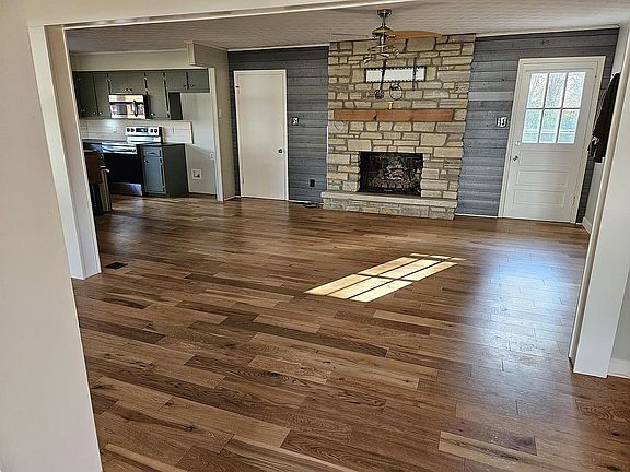 Stone gas fireplaceNew countertopBrick ranchNew appliancesOpen conceptAndersen energy efficient windowsWood floors