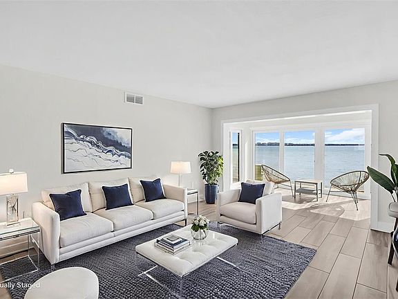 One or more photo(s) was virtually staged. Ground-Floor Waterfront Condo with direct access to residents only white sandy beach in Clearwater Point’s Admiral House (55+) has been meticulously remodeled and is move-in ready. Beautiful Southern views of the Intracoastal Waterway, Sand Key Bridge, and the Gulf of Mexico through floor-to-ceiling windows & sliding doors. Walk out onto the oceanfront patio that connects the main living areas directly to the shoreline. The interior offers 2 bedrooms, 2 full bathrooms, an open kitchen/dining/great room, and a separate Florida room, all oriented toward the water. The new kitchen includes new cabinetry, island with seating and storage, quartz countertops, tiled backsplash, and stainless-steel appliances. Both bathrooms are fully updated with tiled walk-in showers and new vanities. All flooring, doors, lighting, and fixtures have been replaced, and a dedicated laundry room with a new stackable Samsung washer and dryer is located inside the unit. The primary suite features open-water views and direct access to the patio and beach. High-impact hurricane-rated windows and sliders provide peace of mind. Assigned parking space #20 is included with the condo. Residents have use of a large beachfront patio area, 3 heated pools and a spa, waterfront grill stations with dining tables & firepit, and the Clearwater Point beach. The community also offers tennis courts, pickleball, shuffleboard, and security in an active 55+ setting. Located in South Clearwater Beach, the property is close to local restaurants, shops, and entertainment, and is steps from Clearwater Yacht Club and Sand Key Bridge for convenient access on and off the beach. Admiral House has completed both the Milestone Inspection and the Reserve Study, and the association is currently fully funded with no special assessments planned, offering added financial stability for current and future owners. Recent HOA funded improvements include a new tile roof in 2020, flat roof in 2023, and redone car ports.