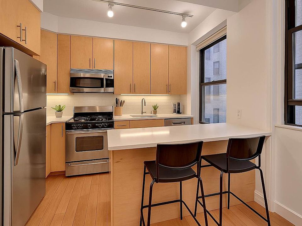 The unit has an updated, chef-like kitchen. The space is outfitted with stainless steel appliances, including a dishwasher. With subway tile, under-cabinet lighting, and overhead lighting, it is a dream kitchen for a cook. One of the best kitchens in this price point.