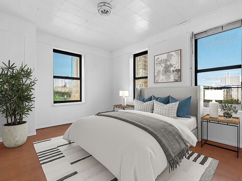 Step inside and be greeted by the original prewar character, high ceilings, and hardwood floors throughout. The spacious living room is ideal for relaxing or entertaining, and oversized windows flood the space with natural light and skyline views.