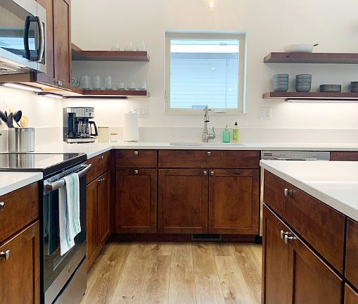 Modern, clean and beautiful home that sleeps 6. Lots of natural light throughout. Large lawn off the back deck just steps from a lovely stream. King bedroom with en suite bathroom and large walk-in closet. Two more bedrooms, each with a queen bed. Main bathroom with shower/tub. Cozy and bright open concept living area. Fully equipped kitchen with island and bar seating. Fully furnished.